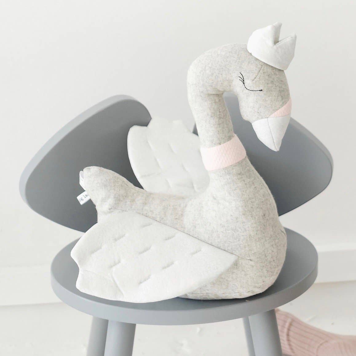 Made with the softest wool blend fabric, eliza is a delicate swan who can add a touch of glamour to any room with her silver wings.