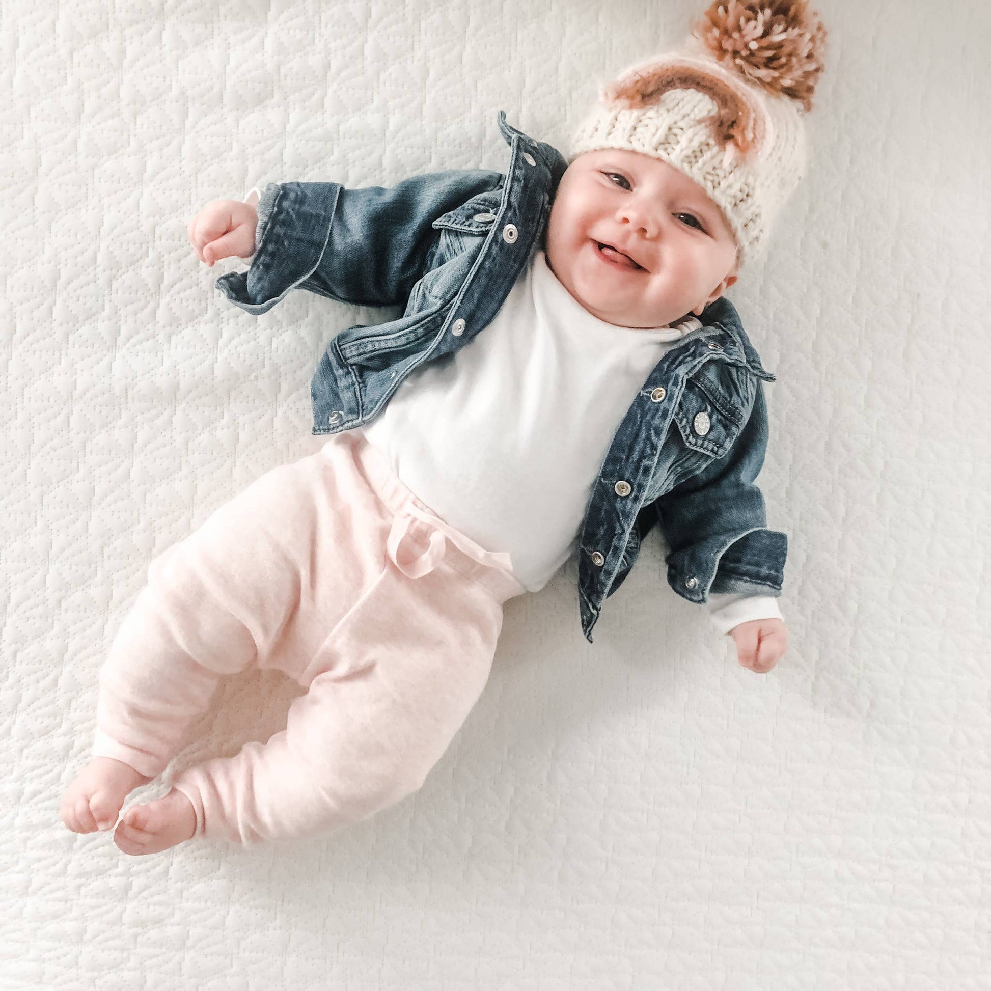 You'll love this beautiful beanie hat in cozy natural colored yarn, adorned with a rainbow in earthy hues of pink and brown. Topped with a pom pom, this looks great with everything.