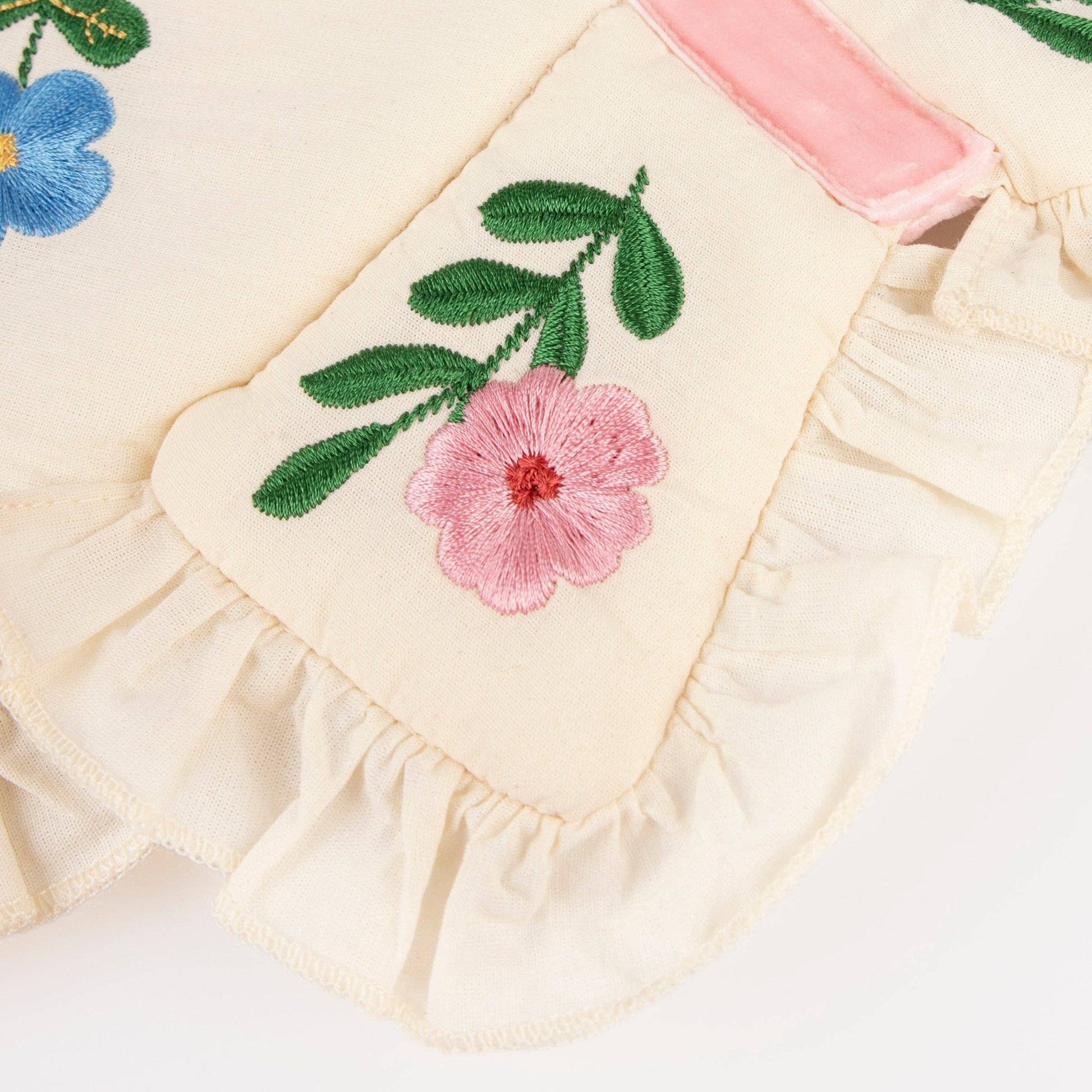 * Embroidered flowers in blue, green, gold, yellow, pink and peach
